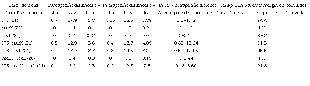 Intra- and interspecific diversity: The aligned sequence lengths were amplified between 865 bp for ITS to 584 bp for rbcL, the ITS region showed the most variable and informative sites of parsimony, followed by matK (Table 4). The intraspecific distances in pairs in the seven bar codes varied from a minimum of 0 to a maximum of 17.9 %. The mean intraspecific distances were minimum for rbcL (0.01 %) and maximum for ITS (5.8 %). Interspecific distances in pairs varied from a minimum of 0 % to a maximum of 18.3 % (Table 4). The mean interspecific distances were minimum for rbcL (0.01 %) and maximum for ITS (5.9 %), therefore, ITS showed the highest intra and interspecific average distance. The combination of sequences from different barcode regions increased intraspecific and interspecific mean distances. The data showed overlap between intraspecific and interspecific distances of the individual or concatenated sequences. The minimum overlap percentage was 91.4 % in combination sequences using two genes (ITS+matK) and the maximum 100 % using the matK region and the combination sequences of two regions (matK+rpoC1) (Table 4).