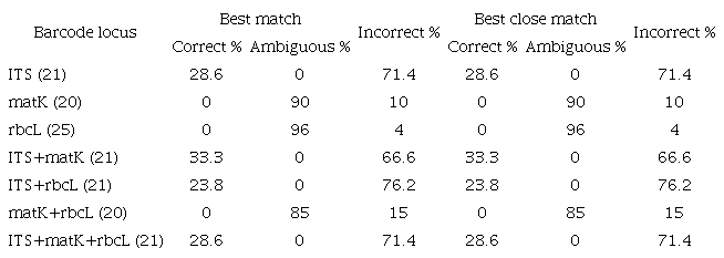 Resultados: Los resultadosmostraron que los enfoques BM y BCM revelaron una baja tasa de identificación correcta de especies para los loci ITS+matK (33.3 %) e ITS (28.6 %), mostrando similitud entre las secuencias. Estos resultados fueron respaldados por análisis basados en árboles, donde todas las regiones individuales y las diferentes combinaciones de genes tuvieron una tasa de discriminación de cero (0 %).