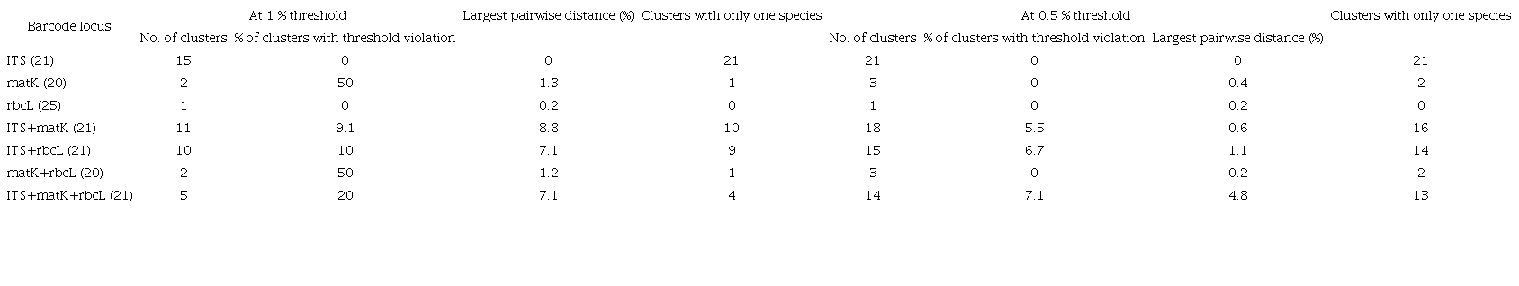 We performed cluster analysis to evaluate the barcodes efficiency to separate the species. As a single locus, ITS was the region that discriminated the best, producing 15 clusters and 21 clusters with a single species at a threshold level of 1 %. The loci combination reduced the number of cluster and cluster single-species. None of the regions were tested to produce clusters with single species profiles. At the same threshold, the combination of all three loci (ITS+matK+rbcL) produced 5 clusters, and 4 of those clusters included single species. At a 0.5 % threshold, the number of clusters in ITS were equal to the 1 % threshold, the combination of two loci (ITS+matK) increased the number of clusters from 11 to 18, and cluster single-species also increased (from 10 cluster at 1 % to 16 cluster at 5 %).