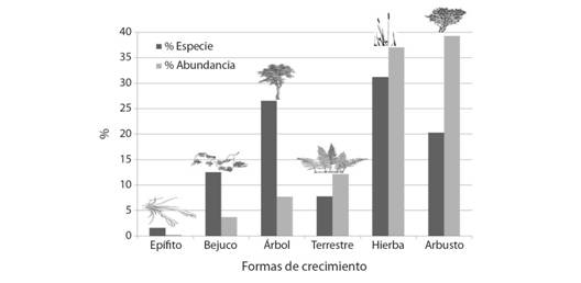 Formas de crecimiento: Se registraron 924 individuos, en seis formas de crecimiento. De la abundancia total, 79 individuos estaban en etapa de plántula.Los arbustos son los más abundantes (363 individuos/39.3 %), seguido de hierbas (342/37 %) y terrestres (112/12.2 %). A nivel específico, las hierbas fueron las más representativas (21 sp./31.25 %), seguido de árboles (17/26.6 %), y arbustos (13/20.3 %); y aunque, los helechos presentan grandes coberturas (6.25 m2), su porcentaje de especies es significativamente menor (5 sp./8.9 %) (Fig. 1).
