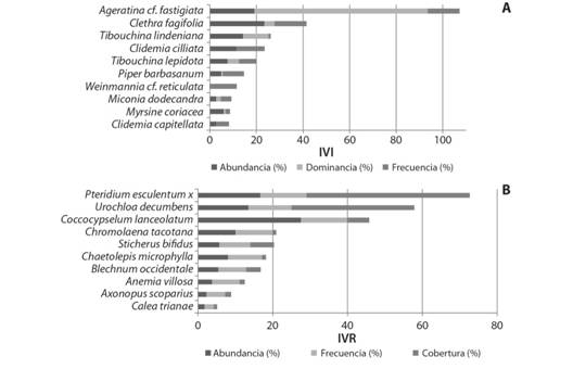 Las especies dominantes son Tibouchinalindeniana (10.93 %) y T.lepidota (4.93 %), frecuentes y abundantes Ageratina cf. fastigiata (17.24 %/27.16 % respectivamente), Clethra fagifolia (16.09 %/22.22 %) y T.lindeniana (12.64 %/19.75 %); las especies restantes presentan valores de importancia inferiores al 20 % (Fig. 2A).