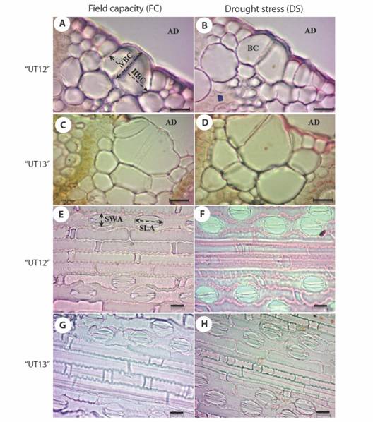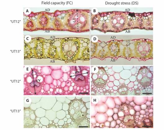 Conclusions: This is the first report describing comparative leaf anatomy of sugarcane Saccharum ‘UT12’ and Saccharum ‘UT13’ in Thailand under drought stress. Results will provide important information to improve adaptation mechanisms of tolerant sugarcane cultivars under initial drought stress situations.