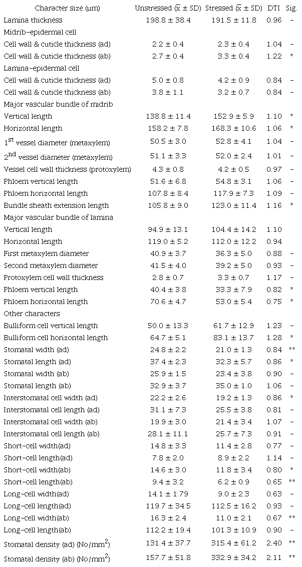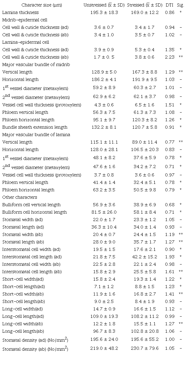 For leaf peeling, both short and long epidermal cells, stomatal density, stomatal size (guard cell and subsidiary cell) were measured under a light compound microscope. Three areas of the leaf blade were free hand transverse sectioned before Safranin O staining, then dehydrated using serial ethyl alcohol and xylene and mounted using DePeX. Anatomical features were studied and recorded using a light compound microscope (Olympus CH 30) and a Zeiss 5402140000004 using the MB2004 configuration AxioVision program. Forty anatomical characteristics were scored based on Nawazish et al. (2006), Zhang et al. (2015) and Taratima et al. (2019) as presented in Table 1 and Table 2.