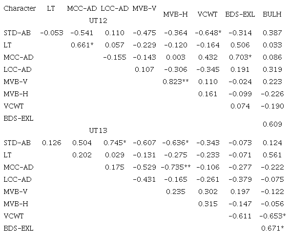Nine anatomical features were calculated for phenotypic correlation coefficient estimation (Table 3). Lamina thickness of Saccharum ‘UT12 and Saccharum ‘UT13’ showed positive correlation with MCC-AD (Midrib cell wall and cuticle thickness-Ad), LCC-AD (Lamina cell wall and cuticle thickness -Ad) and BULH (Bulliform cell horizontal length).
