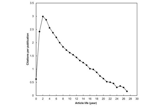 Citation life cycles of the most frequently cited articles: A total of 446 articles had a TC2018 of 100, 52 % with a first-author from the USA (17 %), the UK (12 %), France (6.3 %), Japan (6.1 %), Switzerland (5.8 %), and Netherlands (4.5 %), while 50 % were published by a corresponding-author from the USA (19 %), the UK (13 %), France (7.2 %), Switzerland (5.8 %), and Japan (5.6 %). Table 7 in Appendix 1 shows the ten classic articles with a TC2018 of 1 000 or more (Long et al., 2014). Nine had first- and corresponding-authors from the USA, in the tenth, they were from the UK. Eight articles were published by a big group with 357 to 774 authors. Furthermore, the Vietnam independent article with the highest TC2018 (238 total citations) was “Expanding applications of metal-organic frameworks: Zeolite imidazolate framework ZIF-8 as an efficient heterogeneous catalyst for the Knoevenagel reaction” (Tran, Le & Phan, 2011) by U.P.N. Tran, K.K.A. Le, and N.T.S. Phan from the Department of Chemical Engineering at the HCMC University of Technology.