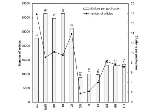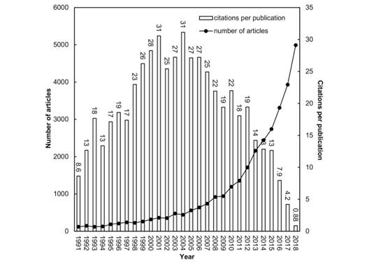 The annual publication output and mean CPP2018 for the years 1991-2018 appear in Fig. 2; they have increased steadily from 119 articles in 1991 to 4 992 articles in 2018; while the highest CPP2018 was found in 2001 and 2004 with CPP2018 of 31 for isolated articles produced by large international research projects.