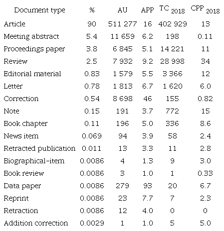 The maximal citations per publication value (CPP2018) was in reviews with 34, which was 2.6 times the citation rate of common articles (Table 1). The mean number of authors per publication (APP) was 93 in data papers, 16 in articles and 9.2 in reviews (Table 1). Web of Science can classify a document in more than one type, for example, 1 332 proceedings papers were also classified as articles, and thus the sum of percentages can be higher than 100 %. We chose only journal articles (31 216 articles) for further analysis because they represented the majority of document types, as well as whole research ideas and results (Ho, Satoh, & Lin, 2010).