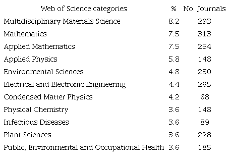 A total of 3 129 articles (10 % of articles) were published in materials science-related categories including multidisciplinary materials science (8.2 %), composites materials science (0.75 %), coatings and films materials science (0.46 %), ceramics materials science (0.31 %), biomaterials materials science (0.29 %), characterization and testing materials science (0.18 %), paper and wood materials science (0.10 %), and textiles materials science (0.048 %). Similarly, a total of 2 625 articles (8.4 % of articles) were published in mathematics-related categories including mathematics (7.5 %), applied mathematics (7.5 %), and interdisciplinary applications mathematics (10 %).