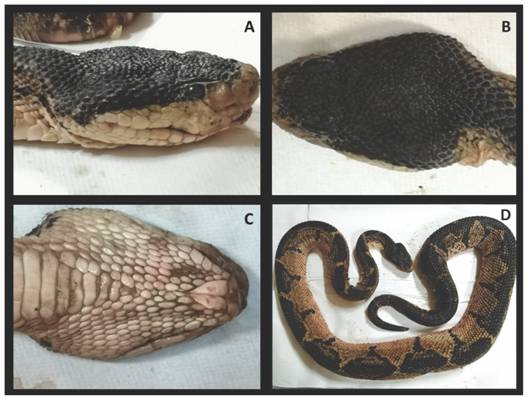 Natural history account:Lachesis melanocephala is a terrestrial species that is mainly active at dusk or night (Solórzano, 2004), although a series of recent observations suggest that this species can be active also during the day. The species often hides among the roots of large trees, under logs, and in patches of dense vegetation mostly in primary and undisturbed secondary forests (Fig. 2A, Fig. 2B, Fig. 2C). The Black-headed Bushmaster also occupies subterranean cavities and mammal burrows, where it resides for indefinite periods. It appears to select strategic locations from which it can passively observe potential prey, a behavior characteristic of other species in the genus (Greene & Santana, 1983; Greene, 1997; Solórzano, 2004, Diniz-Sousa, Moraes, Rodrigues-da-Silva, Oliveira, & Caldeira, 2020). When hunting, it bites and holds on to its prey until it becomes immobilized by the venom, as is reported for other Bushmaster species (Diniz-Sousa et al., 2020). Both adults and juveniles seem to feed exclusively on small mammals, although not much information is available about their diet. Our few stomach contents and fecal analysis reveal rodents such as spiny rats (usually Heteromys desmarestianus and Proechimys semispinosus) and marsupials (family Didelphidae) as common prey items.