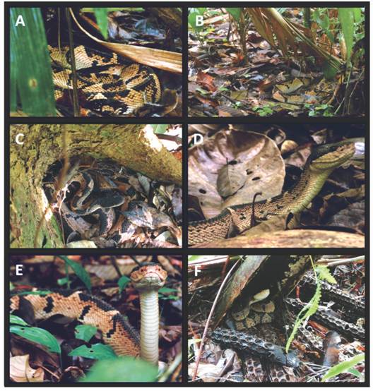 Its defensive behavior includes raising the head and coiling the body in a threatening posture while vibrating the tail forcefully against the ground. The Black-headed Bushmaster has a bad reputation among the species of its genus being an irascible or nervous snake, an idea that prevails even among people accustomed to its handling or capture (Ripa, 1994; Campbell & Lamar, 2004). This reputation possibly derives from the fact that it is a species that is much more willing to lift its head and part of its body during defensive movements and escapes (Fig. 2D). Despite this, in our experience, it seldom shows a disposition to strike.