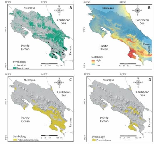 Within the potential distribution of the species, 18 SINAC protected areas are included, counting five national parks and nine wildlife-refuges (Table 2). Approximately 2 936.10 km2 of the potential distribution of L. melanocephala lies within these protected areas (Fig. 3D). This represents 29 % of the species possible range, thus less than a third of the black-headed Bushmaster distribution is currently under some category of protection.