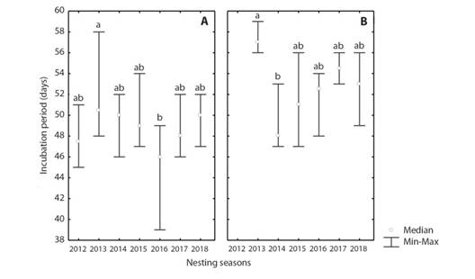As a consequence of high temperatures, the incubation periods are relatively short (Fig. 3). At Antonio beach, the only difference between incubation periods was between 2013 and 2014 (Kruskal-Wallis, P < 0.01). While at La Barca beach, only 2013 was different to 2016 (Kruskal-Wallis, P < 0.05). With the exception of the nests at Antonio beach in 2013, the rest of the years at both beaches had the majority of their incubation period less than or equal to 55 days.