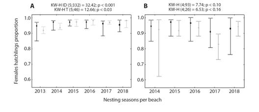Conclusions: In correspondence with the registered temperature and incubation period values, most of the years reflect a hatchling production biased towards females in both beaches.