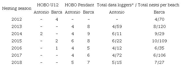 Results: At La Barca beach, there was a 1.5 °C increase in the mean nest temperature from 2012 to 2018, although no differences were found in the period from 2015 to 2018. At Antonio beach, there is no trend since no differences were found in the mean nest temperature except for the years 2013 and 2017, which had lower temperatures than the other seasons. In both beaches mean nest temperature exceeded 30 °C in most of the years. As a result, there was a predominance of nests with incubation periods shorter than 55 days. With these values, a female hatchling production over 90 % is expected in both study sites.