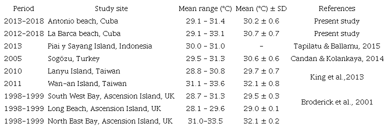 In Table 2 is presented that temperatures found during the sex-determining period at Antonio beach nests are similar to those reported by Broderick, Godley and Hays (2001), Candan and Kolankaya (2014) and Tapilatu and Ballamu (2015). However, they are cooler than those reported at Wan-an Island by King et al., (2013) and those found by Broderick et al., (2001) in Northeast Bay at Ascension Island. La Barca, on the other hand, has a wider range with values up to 33.1 oC. Therefore, they are closer to the higher values reported by Broderick et al., (2001) and King et al., (2013) which were above 33 oC.