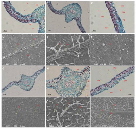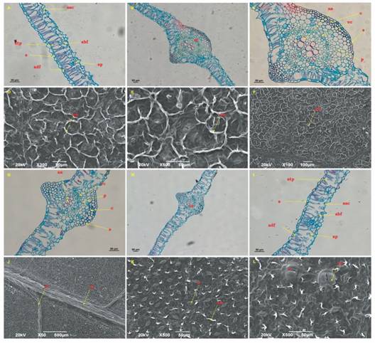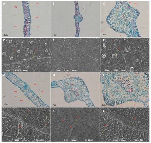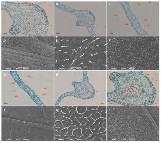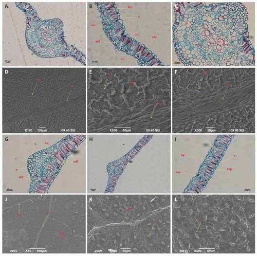 Midrib: The midrib, with annular or angular collenchyma layers on both surfaces, is similar in all varieties and can be distinguished by the number of the cells layer (Fig. 1G, Fig. 1H, Fig. 1I, Fig. 2D, Fig. 2J, Fig. 2L, Fig. 3E, Fig. 3L, Fig. 4D, Fig. 4J, Fig. 4L, Fig. 5J). The fundamental parenchyma fills the space between the collenchyma and the vascular system. The vascular bundle of the midrib is formed by a collateral closed vascular bundle with phloem towards the leaf abaxial face leaflet (Fig. 1E, Fig. 1F, Fig. 1K, Fig. 2D, Fig. 2J, Fig. 2L, Fig. 3E, Fig. 3L, Fig. 4D, Fig. 4J, Fig. 4L, Fig. 5J). In all varieties, the midrib presents qualitative differences in height and width (Table 2), number of the parenchyma layers between the collenchyma on the abaxial surface and the vascular bundle.