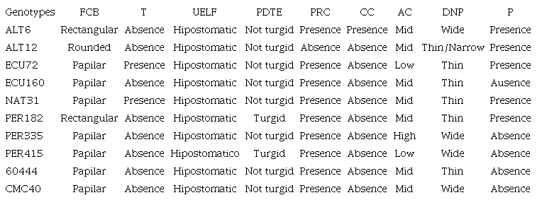 For Scanning Electron Microscope (SEM) observations, ten replicas of leaf segments were taken for each of the varieties studied and fixed in glutaraldehyde in 7.2 pH phosphate buffer for 48 hours. Later, there were dehydrated in 2.2 dimethoxypropane and dried in hexadimethyldilizane (Buravkov, Chernikov, & Buravkova, 2011). The leaf segments were placed on a conductive carbon double-faced tape and coated with gold in a Denton Vacuum Desk IV ionizer for 3 minutes. The processed samples were observed under a JEOL JSM-6490LV microscope. The abaxial face of the leaflet was studied paying special attention to the arrangement of the stomata, presence of trichomes and stomata, and epicuticular wax patterns.