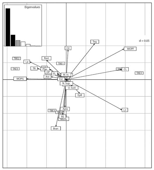 En el ACPD el porcentaje de inercia proyectado en el eje uno fue de 60.64% y en el eje dos de 18.24 %. Según este análisis, el tramo alto en los muestreos (E2 y E4) se asoció con los rasgos; largo del cuerpo 5 a 10 mm, respiración por tegumento, gremio trófico MOPF y grupo funcional alimenticio colector (Fig. 2, Lado derecho). El tramo bajo en el muestreo (E2) y tramo alto (E3) se asociaron con tamaño del cuerpo de 10-20 mm, gremio trófico MOPG, grupo funcional alimenticio triturador (Fig. 2, Lado izquierdo). Por otra parte, los tramos bajos en los muestreos (E3 y E4) presentaron mayor proporción de los rasgos: forma del cuerpo aplanado, respiración por branquias, gremio trófico micrófitas y grupo funcional alimenticio raspador (Fig. 2, Parte inferior central).