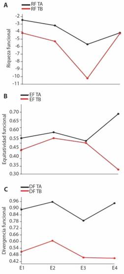 Los descriptores de diversidad funcional muestran diferencias entre tramos y muestreos (Fig. 3). La riqueza funcional es mayor en el tramo alto, aunque en E4, se expresan magnitudes similares entre los tramos, se destaca una reducción de la RF en el E3 para ambos tramos. La equidad funcional muestra una tendencia similar entre tramos, sin embargo, en el E4 este descriptor se incrementa en el tramo alto. Respecto a la divergencia funcional, el tramo alto presenta mayor expresión de DF consistente durante los cuatro muestreos.