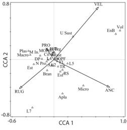 Para establecer las relaciones entre las variables físicas y los rasgos funcionales se realizó un Análisis de Correspondencia Canónica (ACC) empleando la matriz de rasgo por tramo y muestras y los datos físicos estandarizados. Previo al uso del análisis, se exploraron los datos mediante DCA (Análisis de correspondencias sin tendencias) para estimar la longitud de la gradiente, la cual fue de un gradiente 1.9 unidades de desviación estándar, correspondiente a un modelo unimodal seleccionado para el análisis (Lepŝ & Ŝmilauer, 2003). Por otro lado, las abundancias de individuos por cada taxón fueron transformados con log10(x + 1) y se eliminaron los taxones raros (abundancias <10 individuos del total) para el análisis. Para la validación del mismo se utilizó la prueba de permutación de Monte Carlo con 499 permutaciones. Además, se verificó que las variables físicas no estuvieran correlacionadas (Spearman: ρ> |0.8|). Por último, se aplicó la corrección de Bonferroni con el fin de evitar el error de tipo I en los datos. Este análisis se realizó con el programa CANOCO 5.