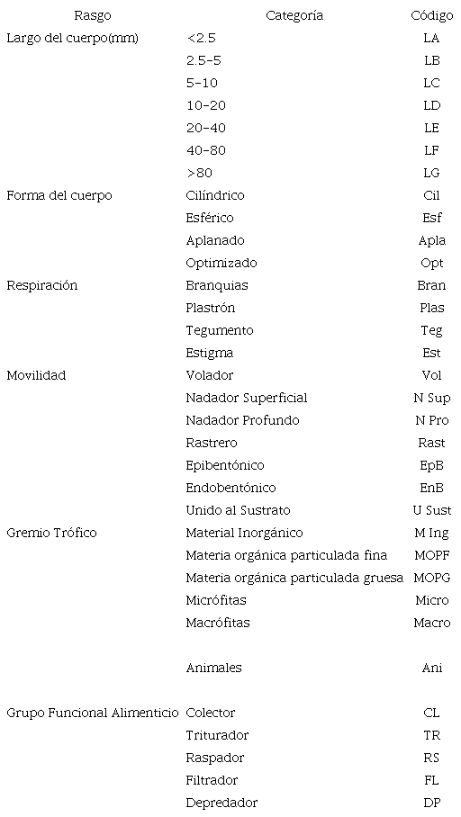 Rasgos funcionales: Los rasgos definidos abarcan seis categorías con sus respectivas modalidades; incluyen características morfológicas, fisiológicas y tróficas (Tabla 1). Se seleccionaron estas categorías de acuerdo con la posible relación con las variables físicas (Bonada, Rieradevall & Prat, 2007; Tomanova & Usseglio-Polatera, 2007). La asignación de los rasgos de: gremio trófico y largo del cuerpo se realizaron mediante mediciones directas de los taxones más abundantes (> 50 individuos en total), el resto de taxones, al igual que los rasgos forma del cuerpo, tipo de respiración, movilidad y grupos funcionales alimenticios se obtuvieron de información disponible de Tachet, Richoux, Bournaud, & Usseglio-Polatera, (2002); Tomanova & Usseglio-Polatera (2007); Chará-Serna, Chará & Zuñiga, (2012); Longo & Blanco, (2014).