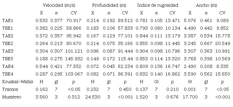 Las variables físicas mostraron una variación entre tramos y muestreos. La velocidad del flujo fue mayor en el tramo alto (Kruskal Wallis test: H= 0.162, gl1= 7, p < 0.05), mientras que el ancho del canal fue mayor en el tramo bajo (Kruskal Wallis test: H= 0.001, gl1= 7, p < 0.05). Por otro lado, el ancho del canal (Kruskal Wallis test: H= 17.7, gl1= 3, p < 0.001) y la profundidad (Kruskal Wallis test: H= 24.530, gl1= 3, p < 0.001) tuvieron valores mayores en el muestro E1. Además, se observó que los valores de velocidad y la profundidad tuvieron un alto coeficiente de variación dentro de los tramos (>50%), respecto a los valores del índice de rugosidad y el ancho del canal (<20%) (Tabla 2).