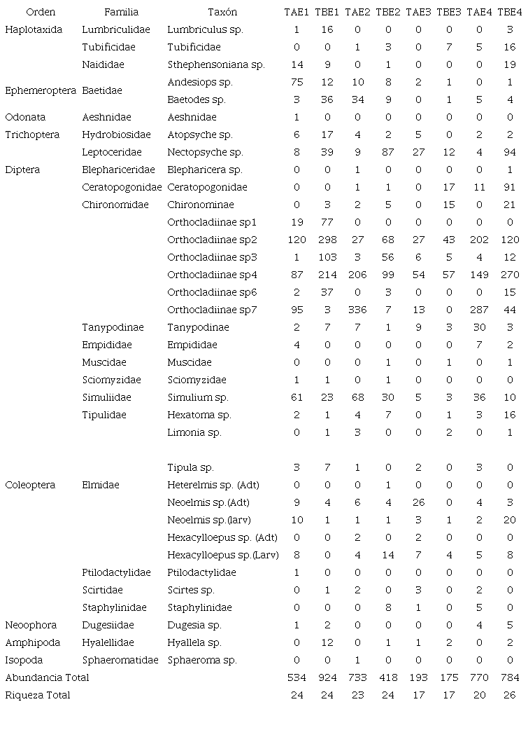 Respecto de los macroinvertebrados, se recolectaron 4 531 individuos distribuidos en 38 taxones. El orden más diverso fue Diptera, distribuido en nueve familias, donde Chironomidae fue lamás diversa, con el 86 % de representación dentro del orden. Asimismo, la subfamilia de quironómidos Orthocladiinae presentóla mayor abundancia. Seguidamente, el orden Coleoptera estuvo representado por cuatro familias de lascuales la más diversa fue Elmidae con cuatro géneros. Por otro lado, el orden Trichoptera se registró en todos los tramos y muestreos con dos familias y dos géneros (Tabla 3). La composición y abundancia no mostraron diferencias significativas entre los tramos (ANOSIM, R= 0.037, p= 0.002) y muestreos (R= 0.167, p= 0.0001). Por otra parte, se resaltó la variación en la abundancia entre tramos de algunos taxones como Orthocladiinae sp7 (TA = 731, TB = 54 Individuos/m2), Nectopsyche sp.(TA = 48, TB = 232 Individuos/m2), Andesiops sp. (TA = 87, TB = 22 Individuos/m2) y Simulium sp. (TA = 167, TB = 76 Individuos/m2) entre muestreos los taxones Orthocladiinae sp2 (E1= 418, E2 = 95, E3= 70 y E4= 322 Individuos/m2), Orthocladiinae sp4 (E1= 301, E2 = 305, E3= 153 y E4= 419 Individuos/m2) (Tabla 3).