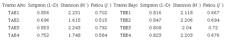 Para estimar la diversidad taxonómica de los macroinvertebrados por tramos y muestreos, se calcularon los índices de diversidad de Simpson (1-D), índice de Shannon Wiener (H´) y el índice de equidad de Pielou (J´) (Moreno, 2001).