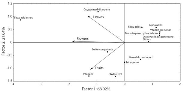 The projection of the main classes of compounds by principal component analysis indicates that factor 1 represents 68 % of the variability of the classes found in the extracts of the leaves, flowers, and fruits of G. integrifolia (Fig. 1). In factor 2, the extracts of leaves and flowers showed a positive correlation, this can be explained because both presented as majority class fatty acid esters (48.2 and 29.9 %, respectively) (Table 1, Fig. 1). However, the extracts of leaves and fruits presented negative correlation in factor 2, the fruit extract showed high concentrations of phytosterols (18.0 %) and vitamins (20.0 %), while in the leaves extract was identified lower concentrations of phytosterols (4.8 %) and did not identified vitamins (Table 1, Fig. 1). In general, the class projection indicates variation between the chemical composition of extracts, mainly those related to the esters of fatty acids, oxygenated diterpenes, vitamins, phytosterols, and sulfur compounds (Fig. 1).