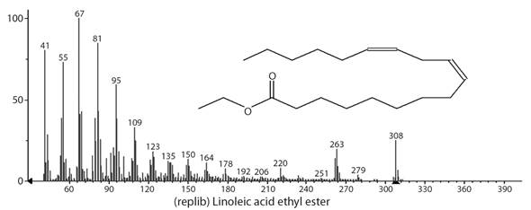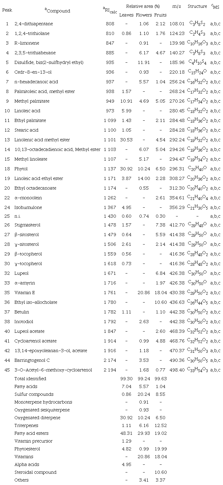 A class of predominant compounds was the esters of fatty acids in flowers (29.9 %), fruits, (19.0 %) and leaves (48.3 %). The vitamins were observed in the flowers (20.9 %) and fruits (18.0 %). The sulfur compounds of the characteristic alliaceous odor of this plant were predominant in the flowers (20.2 %), followed by fruits (8.6 %) and a smaller concentration in the leaves (0.9 %) (Table 1, Fig. 1). The major compounds in the crude extract in the flowers were ethyl ester of linoleic acid (14 %) (Fig. 2) and disulfide, bis (2-sulfhydryl ethyl) (11.9 %) (Fig. 3); in the fruits, they were ethyl iso-allocholate (10.6 %) and stigmasterol (7.4 %); and in the leaves, they were phytol (30.9 %) (Fig. 4), linoleic acid methyl ester (30.5 %) and methyl palmitate (10.9 %). Some major compounds were found only in one part of the plant such as linoleic acid (6.0 %) and isohumulone (5.0 %) just in the leaves; disulfide, bis(2-sulfhydryl ethyl) (11.9 %) and methyl linoleate (5.2 %) were found only in the flowers; and lupeol (6.8 %) and ethyl iso-allocholate (10.6 %) were present just in the fruits (Table 1).