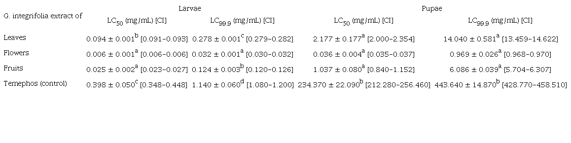 Conclusions: This study opens new perspectives on the use of extracts from G. integrifolia as a bioinsecticide alternative for the control of A. aegypti larvae and pupae.