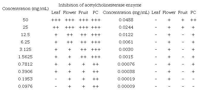 For the inhibiting activity test of acetylcholinesterase enzyme, the crude flower extract presented inhibitory effect at the concentration of 0.00019 mg/mL, followed by the positive control at 0.00038 mg/mL, by the fruit extract (0.0244 mg/mL) and the leaf extract (0.3906 mg/mL). When compared to the ex situ test (LC99.9) with A. aegypti larvae, the extracts from flowers, fruits, and leaves were 16.8, 0.5, and 0.07 %, respectively, less effective than in the bioautographic test in TLC.