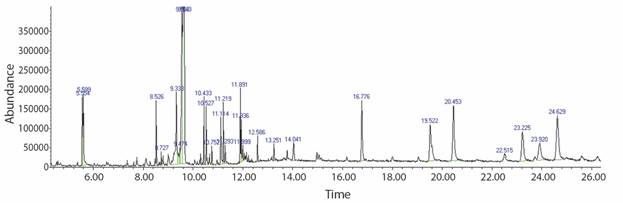 Gas chromatographic-mass spectrometry (GC-MS) analysis for crude extract: Elmer Clarus Mass Spectrometer together with the Agilent Gas Chromatography (Santa Clara, CA, U.S.A.) was performed for GC-MS to analyze the 80 % ethanol extract. A 10 µL syringe was used to inject one microliter (1 µL) into the chromatogram system. The Helium gas transported the analyte in the column at a flow rate of 1.2 mL/min. During the examination, a split ratio of 5:1 was performed. Temperature of the injector has been scheduled at 220 °C. The analytes are extracted from capillary column model Agilent 19091S-433 with HP-5MS, 0.25 mm × 30 m × 0.25 film width. Initially the temperature of the oven had been adjusted at 70 °C for 2.00 min, heating up to 280 °C at 10 °C/min. It took 32.5 min overall. The energy used for ionisation was 60.922eV. Mass measurement was conducted at 300 °C. Identification of compounds was achieved by contrasting the mess spectra with the MS library.