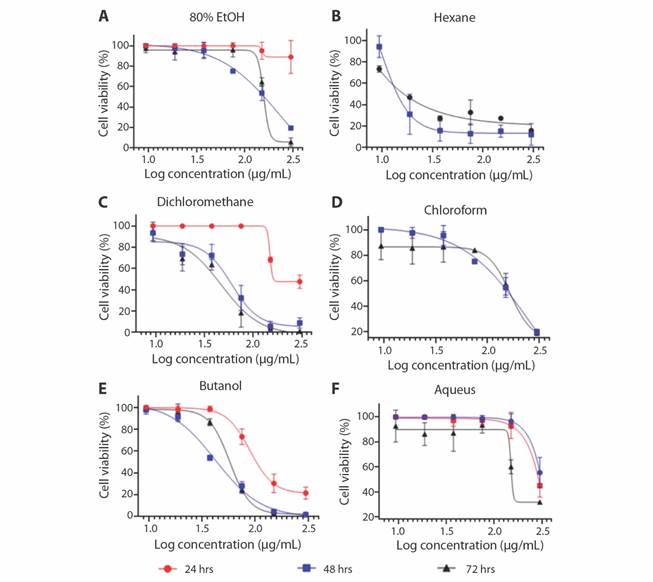 In the present study, the cytotoxic effect (IC50) of the crude ethanol and fractioned extracts (hexane, dichloromethane, chloroform, butanol and aqueous) were identified on one human cancer cells (MCF-7) and one normal non-cancer cells (MCF10A) using the SRB assay. 80 % EtOH extract did not show toxicity on both cell lines (Fig. 2A). Hexane fraction of S. alata exhibited an excellent inhibition towards MCF-7 cells with IC50 of 0.013 µg/mL at 72 h, in comparison to IC50 values of 48 h (Fig. 2B). It is interesting to note that this fraction did not show cytotoxicity against MCF-7 cells at 24 hours. Others, such as dichloromethane and butanol against MCF-7 cell line after 72 hours with IC50 values of 47.11 and 57.61 µg/mL, respectively, have been shown to have significant cytotoxic activity (Table 2; Fig. 2B, Fig. 2C, Fig. 2E). Generally, the 80 % EtOH, chloroform, and aqueous exhibited weaker cytotoxicity profile against the MCF-7 cell line (IC50 > 100 µg/mL). The viability of untreated control cells corresponds to 100 % because all extracts had no cytotoxic effect on the normal cell, though we did not analyze the selectivity index (SI). Although, most importantly, all the extracts did not show the cytotoxic effect on MCF10A as normal human mammary epithelial cells. In addition, IC50 values were determined for SRB assay, extracts and the results are tabulated (Table 4), and also in Fig. 2.