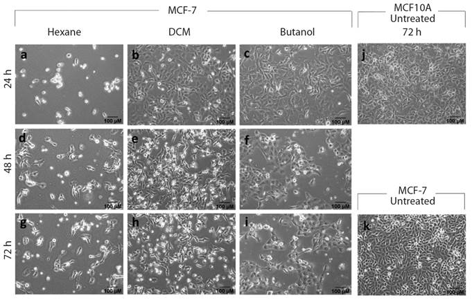 Treated cells were observed for the morphological feature using a bright-field microscope (Olympus, CKX41) at 4X and 10X magnification. MCF-7 and MCF10A cells treated with various extract/fractions and then observed after 72 h incubation (Fig. 3). The results only showed for hexane (Fig. 3A, Fig. 3D, Fig. 3G), DCM (Fig. 3B, Fig. 3E, Fig. 3H) and butanol (Fig. 3C, Fig. 3F, Fig. 3I) fractions.