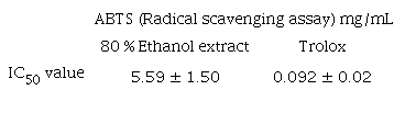 The residue of the plant was then extracted with n-hexane, dichloromethane (DCM), chloroform, butanol and water (aqueous) subsequently in the same way to give 80 % EtOH (10.9 %, yield: 43.9 g), n-hexane (0.22 %, yield: 0.89 g), DCM (0.05 %, yield: 0.18 g), chloroform (0.02 %, yield: 0.09 g), butanol (0.13 %, yield: 0.51 g) and aqueous (0.16 %, yield: 0.65 g) for using 400 g powder leaves of S. alata. This study demonstrates that the ABTS assay IC50 values of Trolox as positive control and 80 % ethanol extract were 0.092 ± 0.02 and 5.59 ± 1.50 mg/mL, respectively (Table 1).