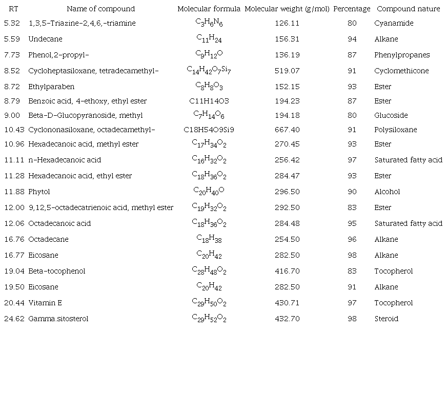 In this analysis, the formula and structure of 20 biomolecules can be predicted. Further study can proceed to the isolation of bioactive compounds, and their structural clarification and evaluation and screening of pharmaceutical activity will be useful for further drug research. GC-MS investigated steroids (ɣ-sitosterol), linear alkanes (undecane, octadecane, eicosane), esters (ethylparaben, benzoic acid, hexadecanoic acid, ethyl ester, hexadecanoic acid, methyl ester), tocopherol (vitamin E and β-tocopherol) as well as fatty acid such as n-hexadecanoic acid and octadecanoic acid in the 80 % EtOH extract.