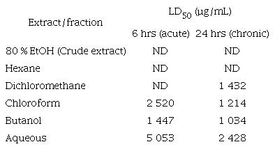 Of the six extracts tested, 2 exhibited no toxicity to the brine shrimps. These included 80 % ethanolic crude extract and n-hexane fraction, in which no mortality was observed during screening. Dichloromethane, chloroform, butanol, and aqueous fractions showed an LC50 value higher than 1 000 µg/mL. There was no cytotoxic effect on any of the concentrations of the candle bush 80 % ethanol extract and hexane fraction using the BSLT method and, brine shrimp were still moved vigorously. However, the other four extracts showed practically non-toxic (LC50 > 1 000 µg/mL) to brine shrimps. These extracts were aqueous, dichloromethane, chloroform, and butanol with LC50 values between 1 034-2 428 µg/mL (after 24 hrs).