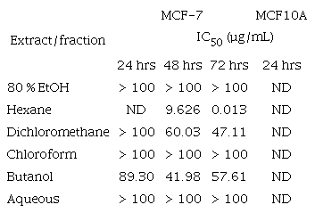 Results: The brine shrimp lethality bioassay exhibits no cytotoxicity even at high concentration (5 000 µg/mL). The LC50 for dichloromethane, chloroform, butanol, and aqueous were > 1 000 µg/mL (non-toxic). The IC50 for in vitro SRB cytotoxicity against MCF-7 for n-hexane was 0.013 µg/mL, which was considered highly toxic, while dichloromethane and chloroform recorded at 47.11 and 57.61 µg/mL, respectively after 72 hours exposure time although there was no cytotoxicity found on the normal cell line.