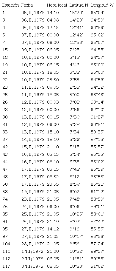 El material zooplanctónico fue recolectado durante el crucero oceanográfico Domo I a bordo del B/O “Mariano Matamoros”, que se realizó durante febrero y marzo de 1979; se hicieron 37 arrastres de zooplancton. Los muestreos se realizaron utilizando una red estándar tipo CalCoFi con una malla de 0.3 mm mediante arrastres oblicuos en la zona epipelágica (0-200 m). Se colocó un contador de flujo TSK-946 en la boca de la red, previamente calibrado, con el fin de poder determinar el volumen de agua filtrada; los muestreos se incrementaron al detectar la zona de afloramiento del Domo de Costa Rica, de tal manera, que la mayor parte de las estaciones provienen del área comprendida entre los paralelos 7° a 12° de latitud Norte y 86° a 92° de longitud Oeste (Tabla 1).