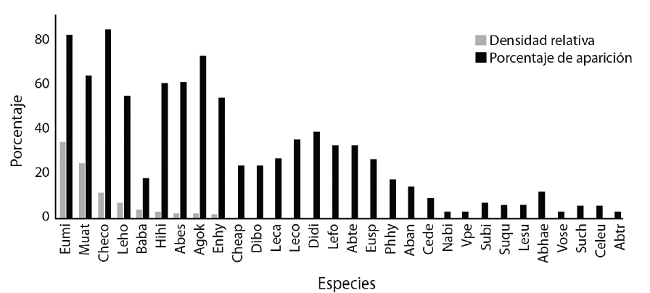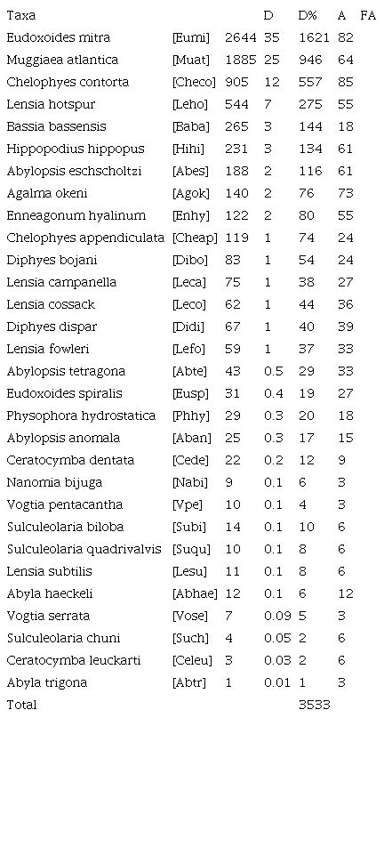Las especies con mayor densidad relativa fueron los difidos Eudoxoides mitra, Muggiaea atlantica, Chelophyes contorta y Lensia hotspur (Fig. 1); en cuanto al porcentaje de aparición en la región de estudio, Chelophyes contorta ocupó el 85 % de las estaciones de muestreo, seguida por E. mitra, M. atlántica, Abylopsis eschscholtzi y Agalma okeni se presentaron en el 82%, 73%, 64% y 61%, respectivamente, perteneciendo las dos primeras a Diphydae, la tercera a Abylidae y la última al fisonéctido de la familia Agalmatidae (ver Lista taxonómica y Tabla 2).