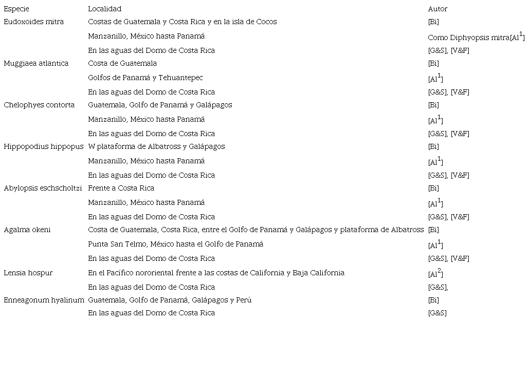 Sulculeolaria chuni apareció con una abundancia muy baja y una distribución restringida a solo dos estaciones y no fue citada por Alvariño (1971) en su listado de especies del Pacífico. De las especies con categoría de raras, tiene especial importancia V. serrata que no fue registrada en los trabajos de Bigelow (1911), Bigelow (1931) y Alvariño (1969a), Alvariño (1971), Alvariño (1974). Sin embargo Alvariño (1967a) describe a V. kuruae como nueva especie que habita las aguas mesopelágicas en muestreos realizados frente a San Diego, California y vuelve a nombrarla en Alvariño,1967b y Alvariño,1971. Schuchert (2019) actualmente la considera no válida y en sinonimia con V. serrata, por lo tanto la primera observación para las aguas del Domo fue la realizada por Vicencio-Aguilar & Fernández-Álamo (1996) como V. kuruae. Bigelow & Sears (1937) observaron a V. serrata a considerables profundidades (1066 a 2900 m) en la Bahía de Cádiz, España y Moser (1925) considera que esta especie puede aparecer ocasionalmente en la superficie y la pregunta importante es si su presencia en el área de estudio se debe que fue sacada a la superficie por el afloramiento del Domo y por lo tanto puede ser considerada como especie indicadora de dicho fenómeno.