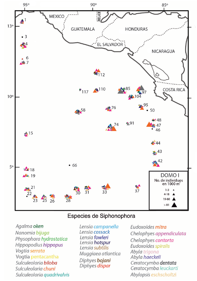 La Fig. 2 muestra la distribución y la densidad de las 30 especies de sifonofóros determinadas en este estudio, en el Pacífico centroamericano. Se puede apreciar que, en general, la mayor riqueza de especies y la mayor densidad de algunas de ellas se presentan en la región frente a las costas de El Salvador, Nicaragua y Costa Rica.