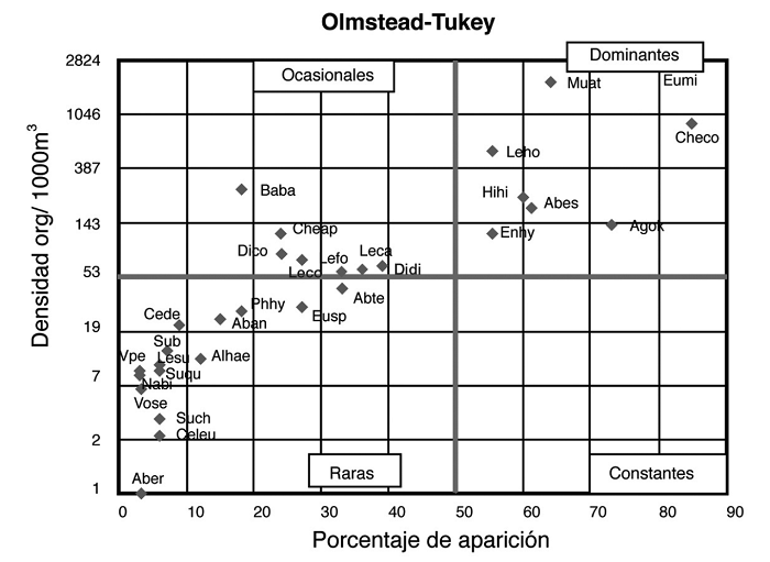 Para determinar la jerarquización ecológica de las especies se realizó la prueba de asociación de dos variables de Olmstead-Tukey (Sokal & Rohlf, 1995), que relaciona la densidad (org./1000m3) con el porcentaje de su aparición en el área de estudio, proporcionando un gráfico sencillo.