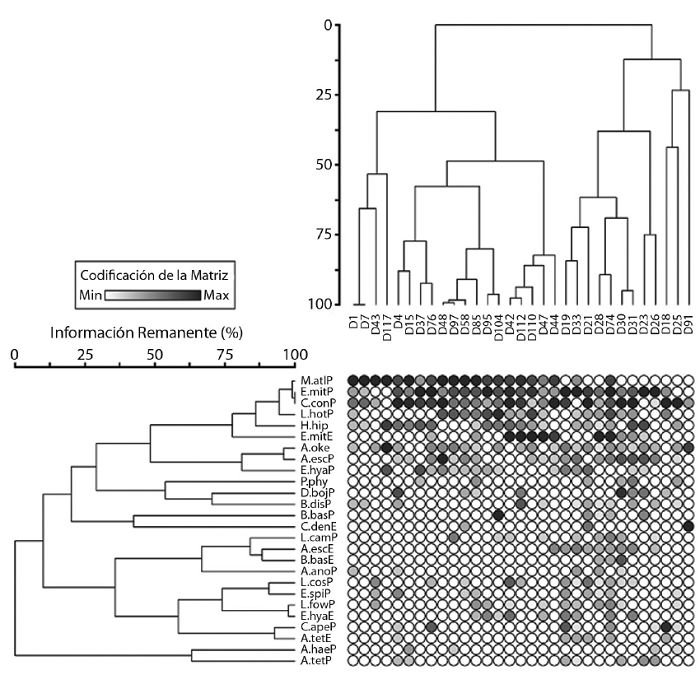 De acuerdo a estos parámetros y aplicando la prueba de asociación de Olmstead-Tukey, la jerarquización ecológica de la comunidad de sifonóforos fue la siguiente: como especies dominantes quedaron Chelophyes contorta, Eudoxoides mitra, Agalma okeni, Muggiaea atlantica, Abylopsis eschscholtzi, Hippopodius hippopus, Lensia hotspur, y Enneagonum hyalinum. En la categoría de ocasionales se observaron a Diphyes dispar, Lensia campanella, Lensia fowleri, Lensia cossack, Chelophyes appendiculata, Diphyes bojani y Bassia bassensis, mientras que las 15 especies restantes quedaron en la categoría de raras (Fig. 3).