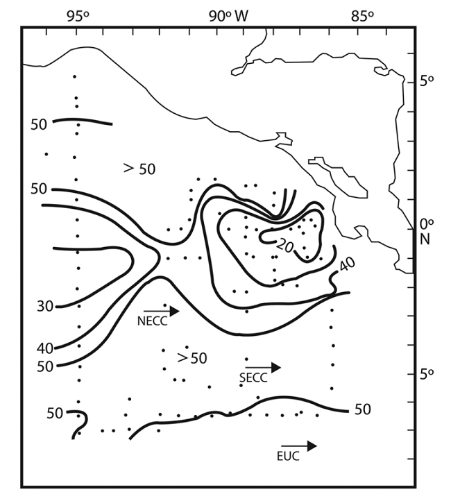 En general podemos resumir que el gran número de organismos y la gran diversidad de sifonóforos encontrada en este estudio en el Domo de Costa Rica, muestra la gran importancia que tienen dentro de la productividad secundaria y su relación con la presencia del Domo (Fig. 5). El Domo de Costa Rica es una zona de alta productividad primaria, que genera un aumento considerable en las comunidades de zooplancton, lo que se reflejó durante el presente estudio con el registro de altas concentraciones de sifonóforos en la parte central y occidental del Domo, entre los 9° y 11° N y entre los 85° y 91°W, confirmando los resultados obtenidos por De la Torre (1982) y Flores (1985), quienes registran los valores más altos de biomasa planctónica en esta región y se ha documentado que los sifonóforos tienen una significativa contribución en la biomasa total del zooplancton (Robinson, 2004).