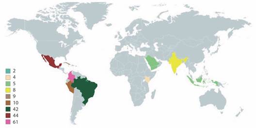 Distribución de los HMA asociados al cultivo de café: El análisis sobre la identificación basada en caracteres morfológicos mostró que existen más de 100 especies de HMA que se asocian a las plantas de café en diferentes países del mundo (Fig. 1). De acuerdo con datos de la lista de especies actualizada en febrero del 2020 (http://www.amf-phylogeny.com/amphylo_species.html) existen 334 especies reportadas de HMA, por lo que el número de especies asociadas al café representa la tercera parte del total de las especies existentes. Estas 100 especies están distribuidas en 20 géneros, 9 Familias, 5 órdenes y 3 clases, de acuerdo con la Clasificación de Redecker et al. (2013).