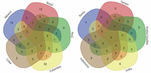 Especies de HMA en África y Asia: El mayor número de especies en África y Asia se encuentran en la familia Acaulosporaceae (32 especies), al igual que en América. India es el país con mayor número de reportes 8 (Bhattacharya & Bagyaraj, 2002), seguido de Yemen (Mahdhi, Tounekti, Al-Turki, & Khemira, 2017), Arabia Saudita (Mahdhi et al., 2017) e Indonesia con 5 (Arif et al., 1999) y Kenia solo reporta 4 (Jefwa et al., 2009). No se comparte ninguna especie entre Arabia Saudita, India, Indonesia, Kenia y Yemen. La India tiene 8, el mayor número de especies. Indonesia y Kenia tienen especies únicas dentro de cada país, mientras que, Arabia Saudita y Yemen tienen 3 especies idénticas.
