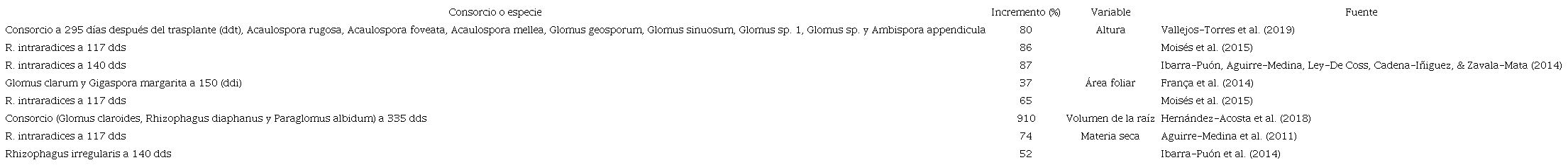 En la producción de café es común el uso de compostas y vermicompostas, que junto con el uso de biofertilizantes a base de HMA, bacterias fijadoras de nitrógeno y solubilizadores de fósforo, promueven prácticas agronómicas amigables y compatibles con el medio ambiente (Hernández-Acosta et al., 2018; Perea-Rojas et al., 2019). Pruebas con Rhizophagus clarus en café, mostraron un aumento significativo en la biomasa (80 %), altura (45 %), contenido de fósforo (de 45.5 a 70.6 %), nitrógeno (del 52.3 a 197 %) y potasio (26.7 %) con respecto a las plantas no inoculadas (Fonseca et al., 2019).
