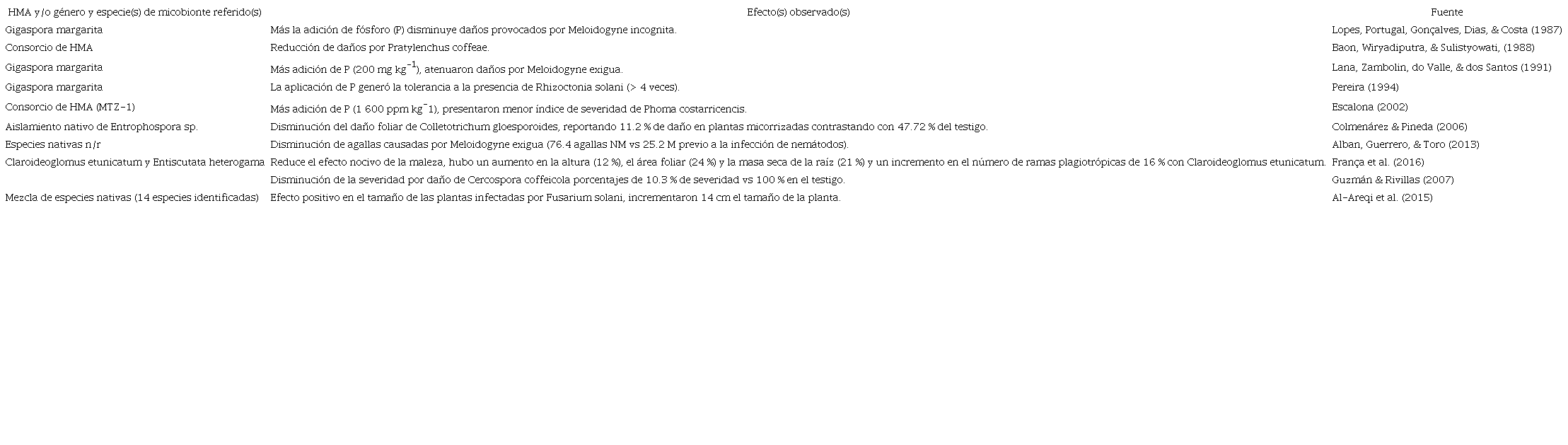 Distintos autores (Tabla 2) reportan los mecanismos de protección de los HMA al sistema radical: 1) al proporcionar una barrera física al patógeno que invade, 2) al competir con el patógeno por recursos y espacios vitales, 3) al producir una variedad de antibióticos y otras toxinas que actúan contra los organismos patogénicos (químicos antagónicos) y 4) al cambiar la cantidad y tipo de exudados radicales de la planta que deterioran a las poblaciones antagónicas de la micorrizósfera.
